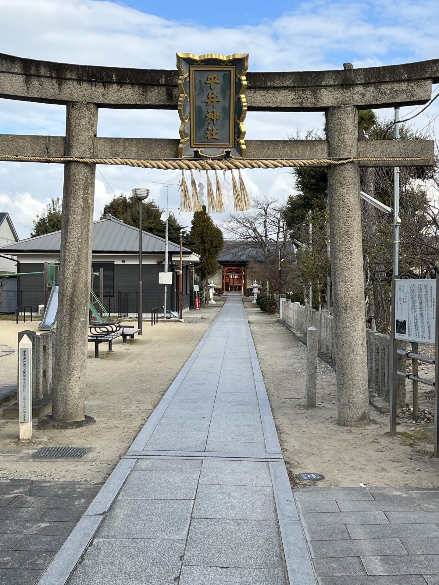 近鉄京都線の久津川駅のすぐ西側に「平井神社」の境内があり(元は、同市「城陽市」の平川廃寺跡の場所にあった)駅前には、地元のスーパーや飲食店があり駅の乗降客も多く普段から人通りが絶えません。両側に杉や桜の木が植えられ、長い参道をぬけると平井神社の本殿の前に出ます。