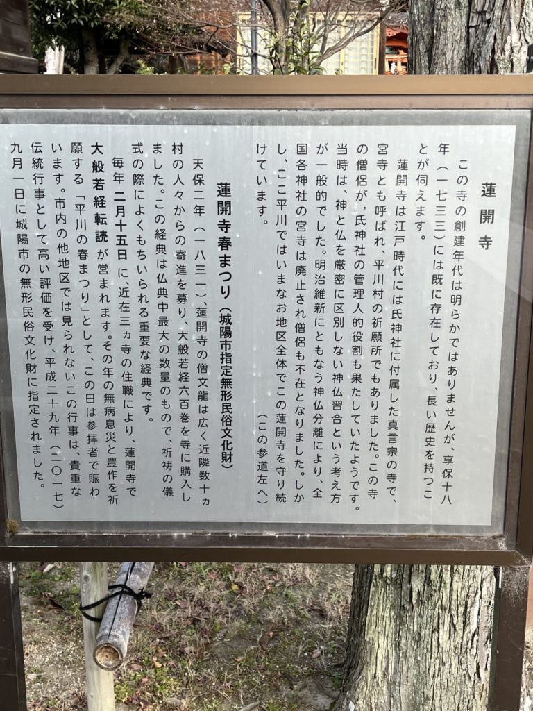 蓮開寺 このお寺の創建年代は、明らかではありません。江戸時代には、氏神社に付属した真言宗の寺で宮寺とも呼ばれ、平川村の祈願所でもありました。